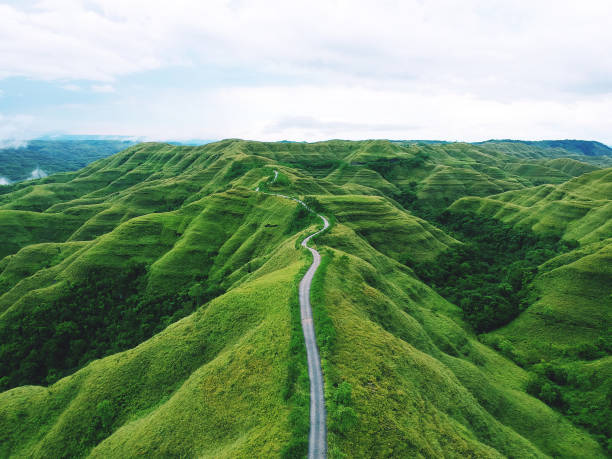 Aerial drone view: A long winding road between hills of green grass in remote parts of the Indonesian island of Sumba